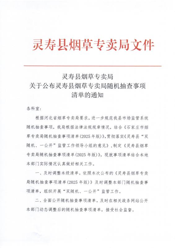 灵寿县烟草专卖局关于公布灵寿县烟草专卖局随机抽查事项清单的通知