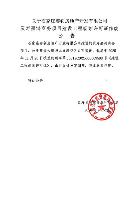 关于石家庄睿钊房地产开发有限公司灵寿嘉鸿商务项目建设工程许可证作废公告