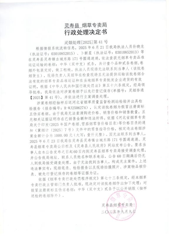 灵寿县烟草专卖局行政处理决定公示 灵烟处理【2025】第41号
