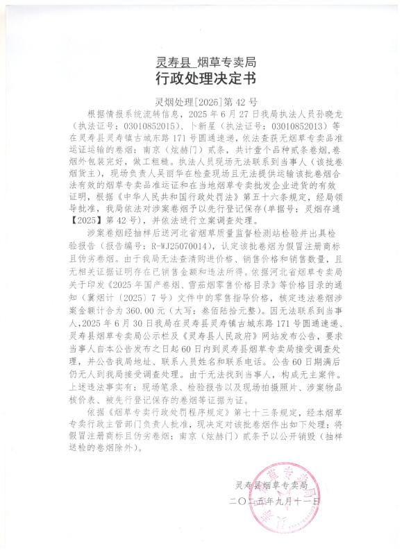 灵寿县烟草专卖局行政处理决定公示 灵烟处理【2025】第42号