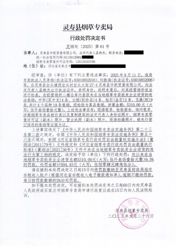 灵寿县烟草专卖局行政处罚决定公示 灵烟处【2025】第61号
