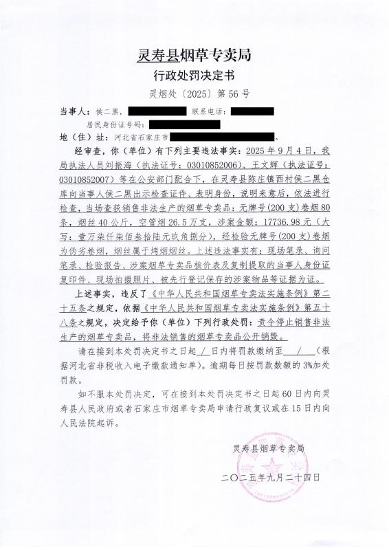 灵寿县烟草专卖局行政处罚决定公示 灵烟处【2025】第56号