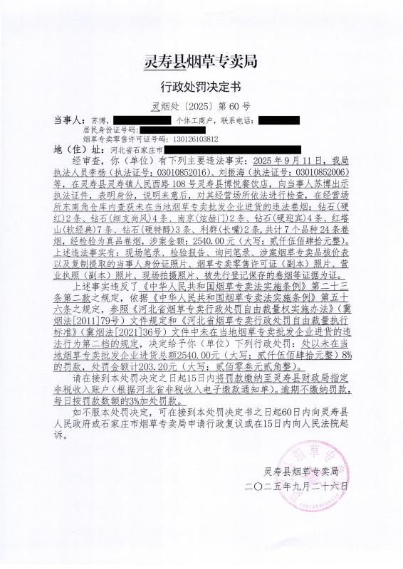 灵寿县烟草专卖局行政处罚决定公示 灵烟处【2025】第60号