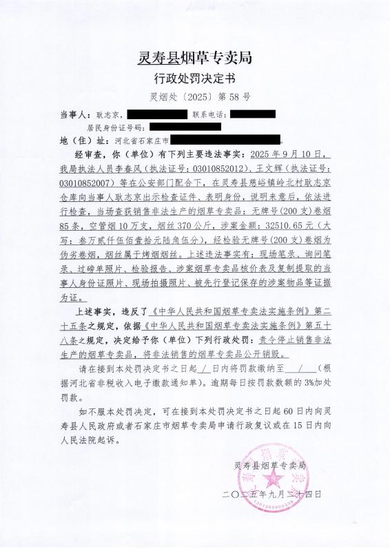 灵寿县烟草专卖局行政处罚决定公示 灵烟处【2025】第58号