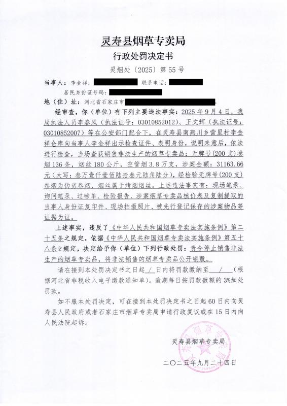 灵寿县烟草专卖局行政处罚决定公示 灵烟处【2025】第55号