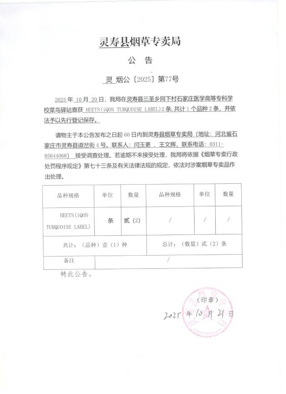 灵寿县烟草专卖局公告 灵烟公【2025】第77号