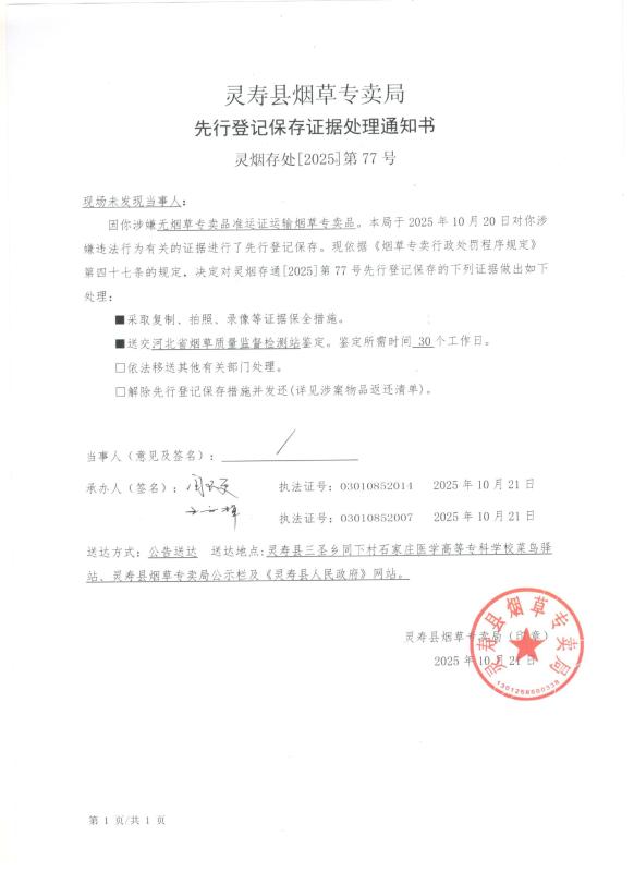 灵寿县烟草专卖局先行登记保存证据处理通知书 灵烟存处【2025】第77号