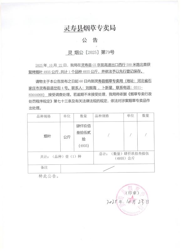 灵寿县烟草专卖局公告 灵烟公【2025】第79号