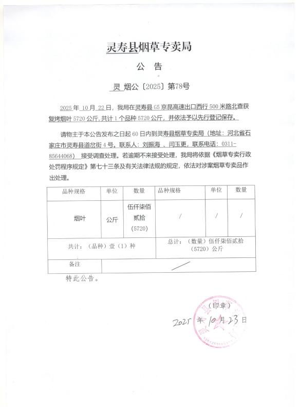 灵寿县烟草专卖局公告 灵烟公【2025】第78号