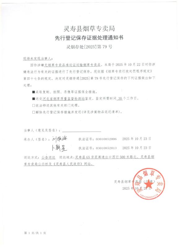 灵寿县烟草专卖局先行登记保存证据处理通知书 灵烟存处【2025】第79号