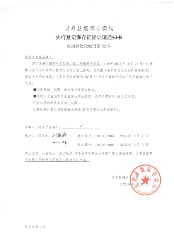 灵寿县烟草专卖局先行登记保存证据处理通知书 灵烟存处【2025】第82号