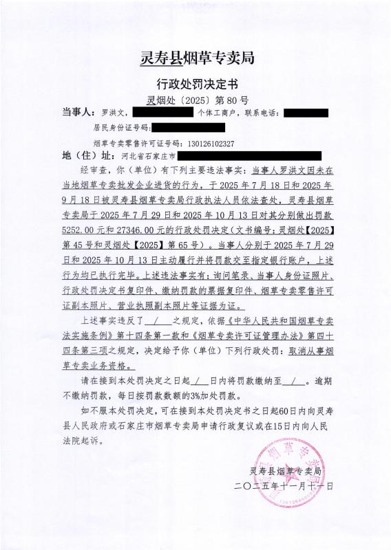 灵寿县烟草专卖局行政处罚决定公示 灵烟处【2025】第80号