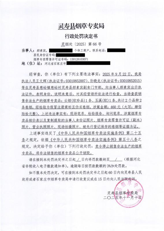 灵寿县烟草专卖局行政处罚决定公示 灵烟处【2025】第66号