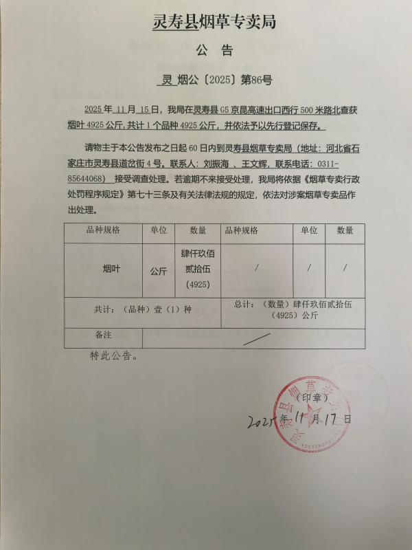 灵寿县烟草专卖局公告 灵烟公【2025】第86号