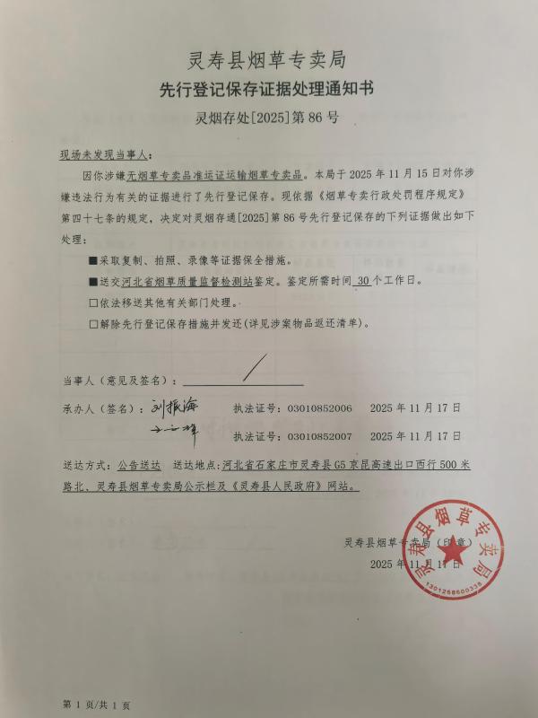 灵寿县烟草专卖局先行登记保存证据处理通知书 灵烟存处【2025】第86号