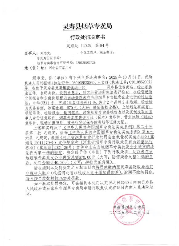 灵寿县烟草专卖局行政处罚决定公示 灵烟处【2025】第84号