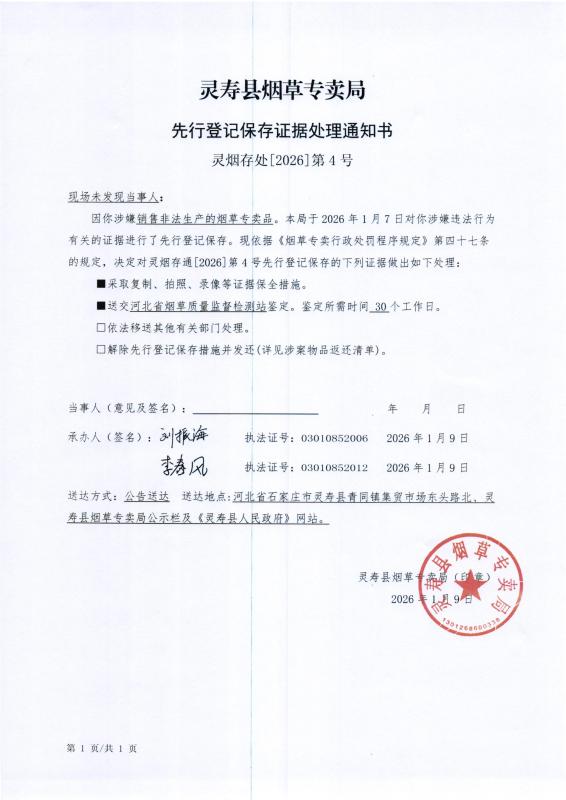 灵寿县烟草专卖局先行登记保存证据处理通知书 灵烟存处【2026】第4号