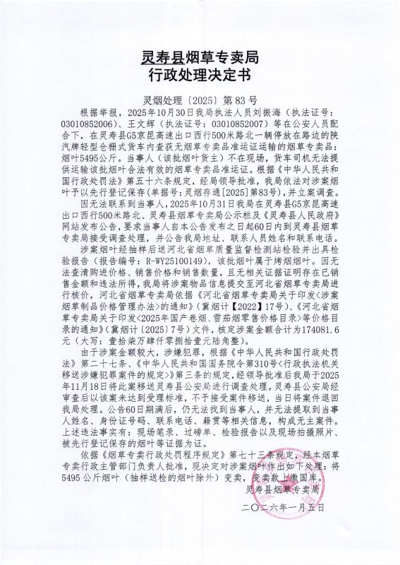 灵寿县烟草专卖局行政处理决定公示 灵烟处理【2025】第83号