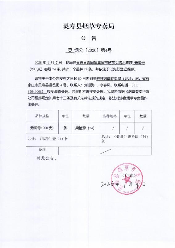 灵寿县烟草专卖局公告 灵烟公【2026】第4号