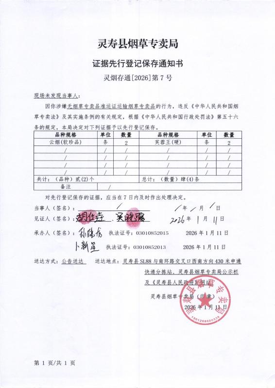 灵寿县烟草专卖局证据先行登记保存通知书 灵烟存通【2026】第7号