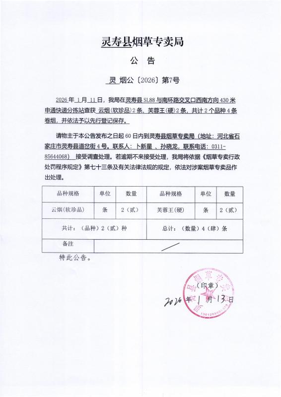 灵寿县烟草专卖局公告 灵烟公【2026】第7号