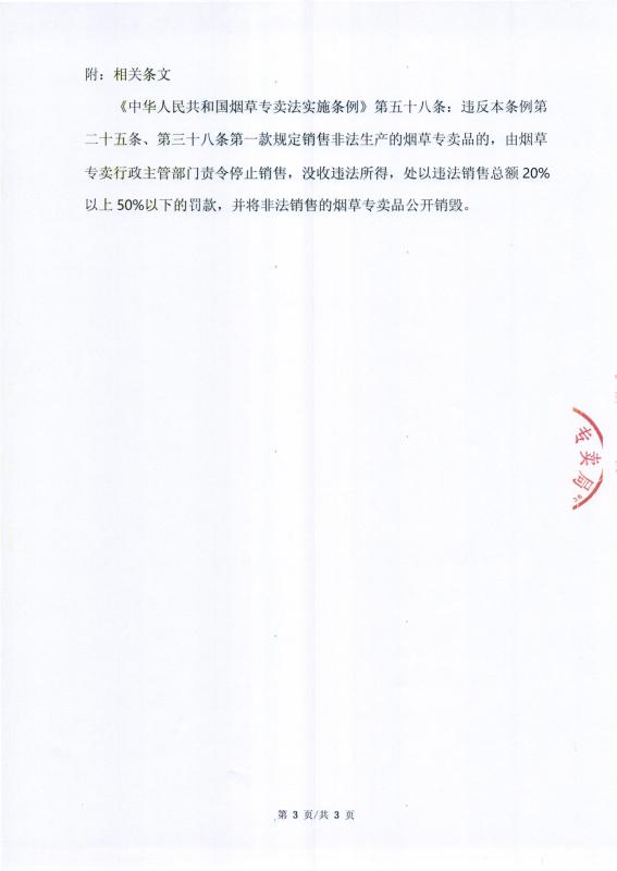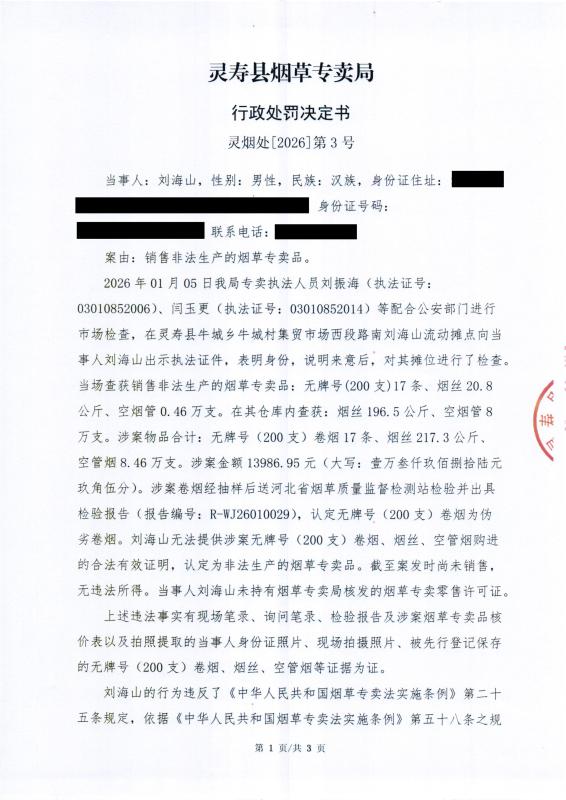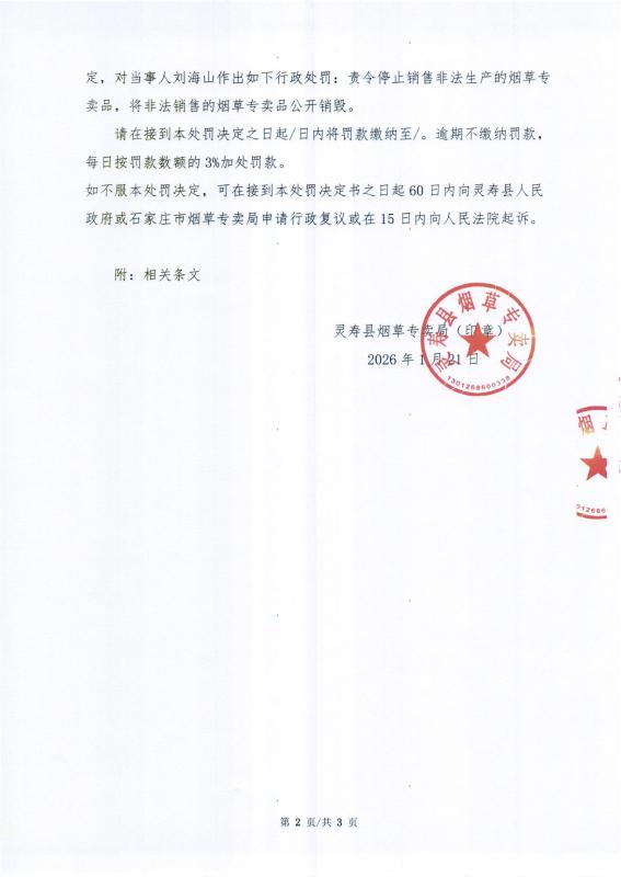 灵寿县烟草专卖局行政处罚决定公示 灵烟处【2026】第3号