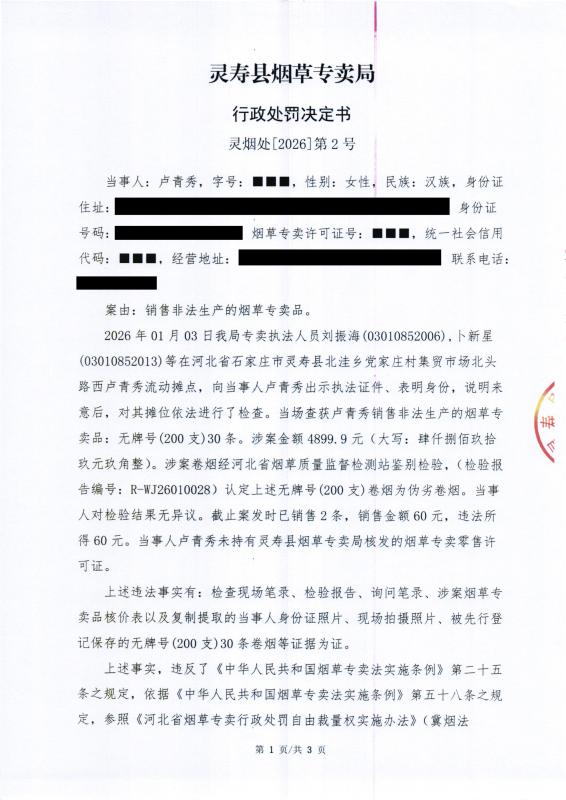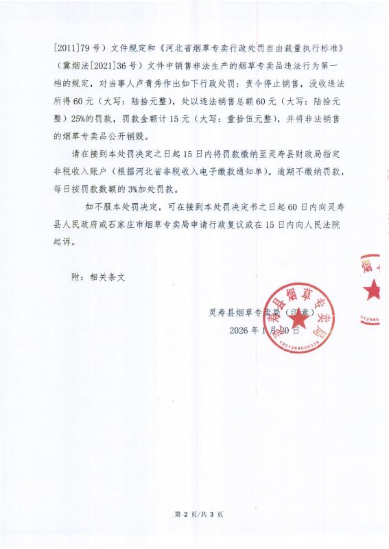 灵寿县烟草专卖局行政处罚决定公示 灵烟处【2026】第2号