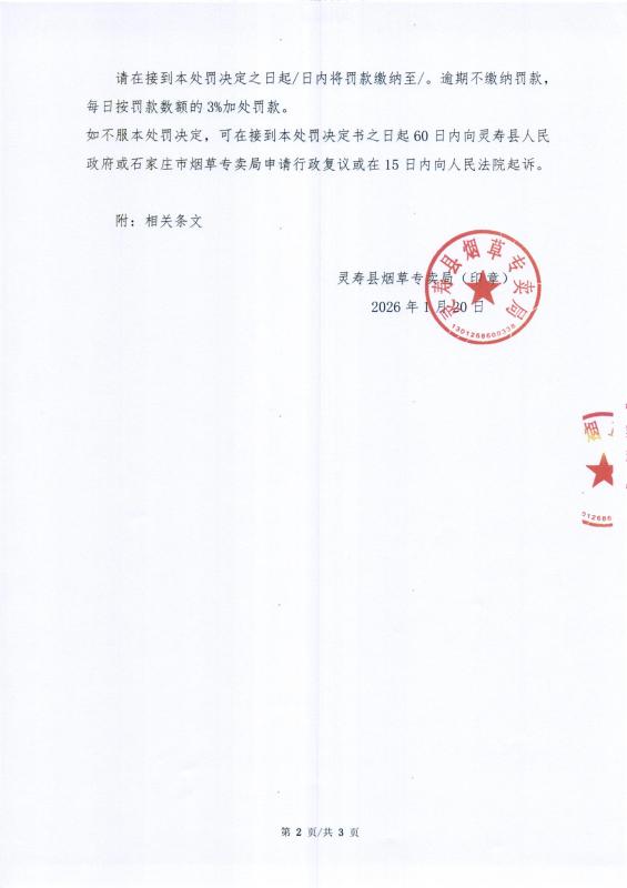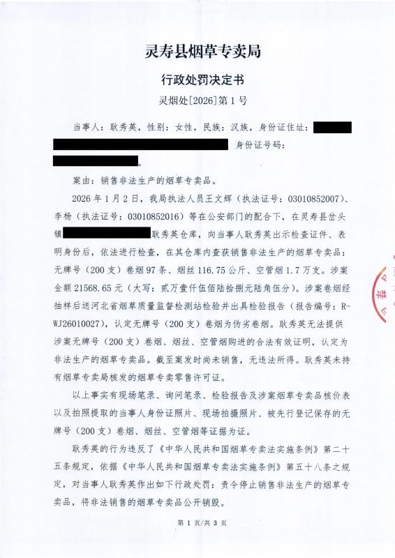 灵寿县烟草专卖局行政处罚决定公示 灵烟处【2026】第1号