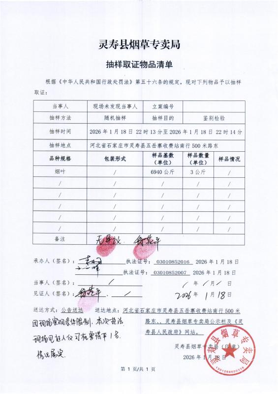 灵寿县烟草专卖局抽样取证物品清单
