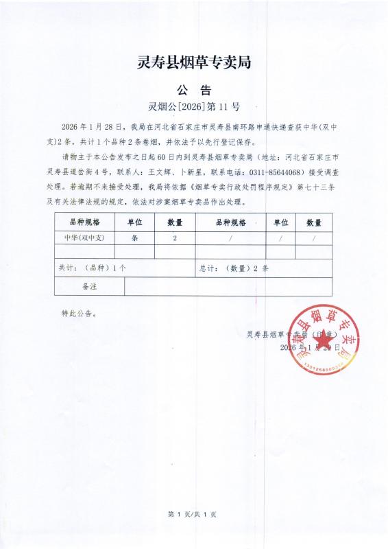 灵寿县烟草专卖局公告 灵烟公【2026】第11号