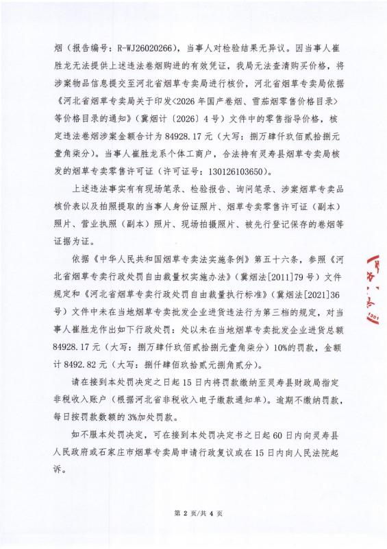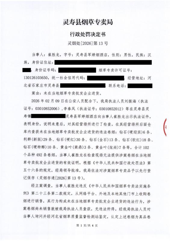 灵寿县烟草专卖局行政处罚决定公示 灵烟处【2026】第13号