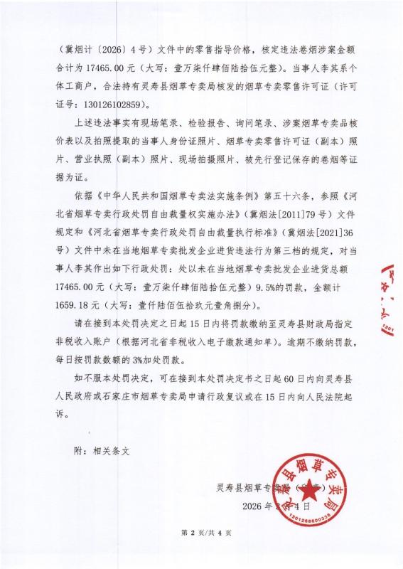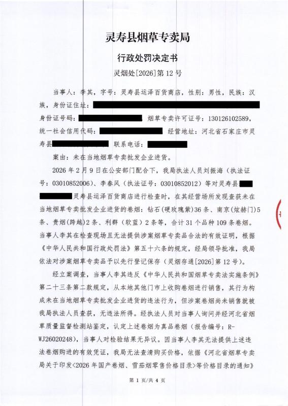 灵寿县烟草专卖局行政处罚决定公示 灵烟处【2026】第12号