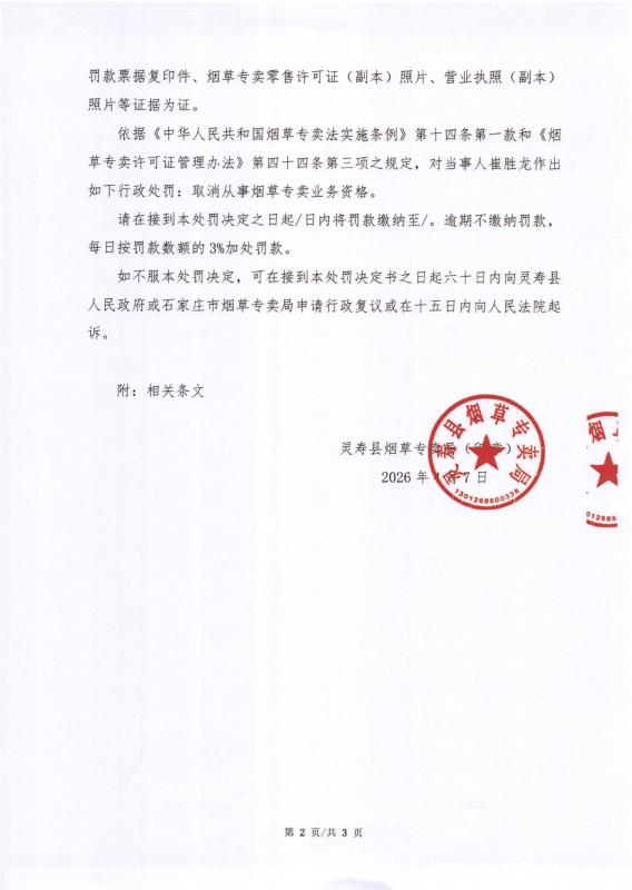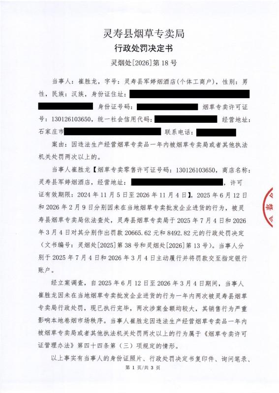 灵寿县烟草专卖局行政处罚决定公示 灵烟处【2026】第18号