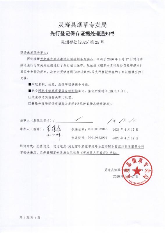灵寿县烟草专卖局先行登记保存证据处理通知书 灵烟存处【2026】第25号