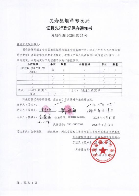 灵寿县烟草专卖局证据先行登记保存通知书 灵烟存通【2026】第25号