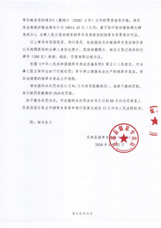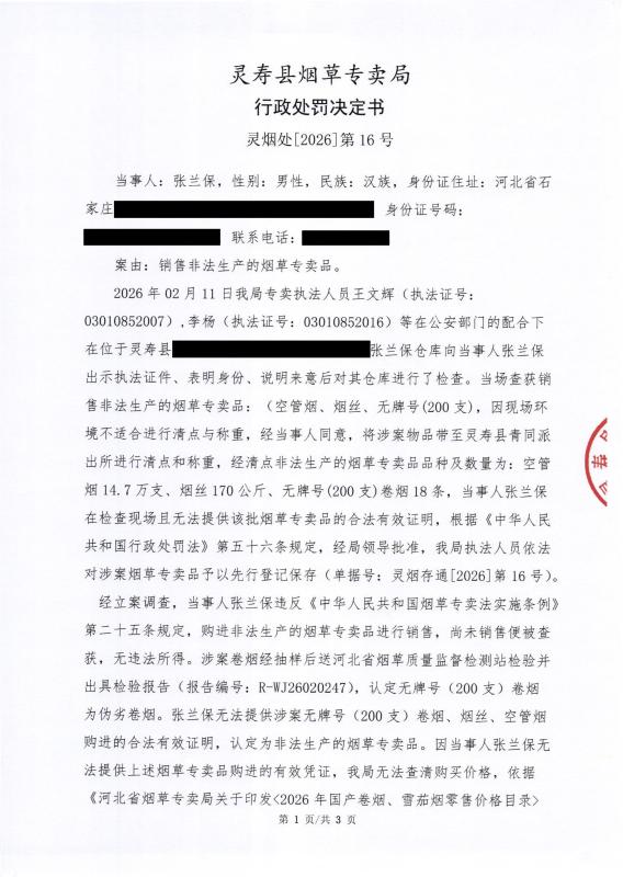 灵寿县烟草专卖局行政处罚决定公示 灵烟处【2026】第16号