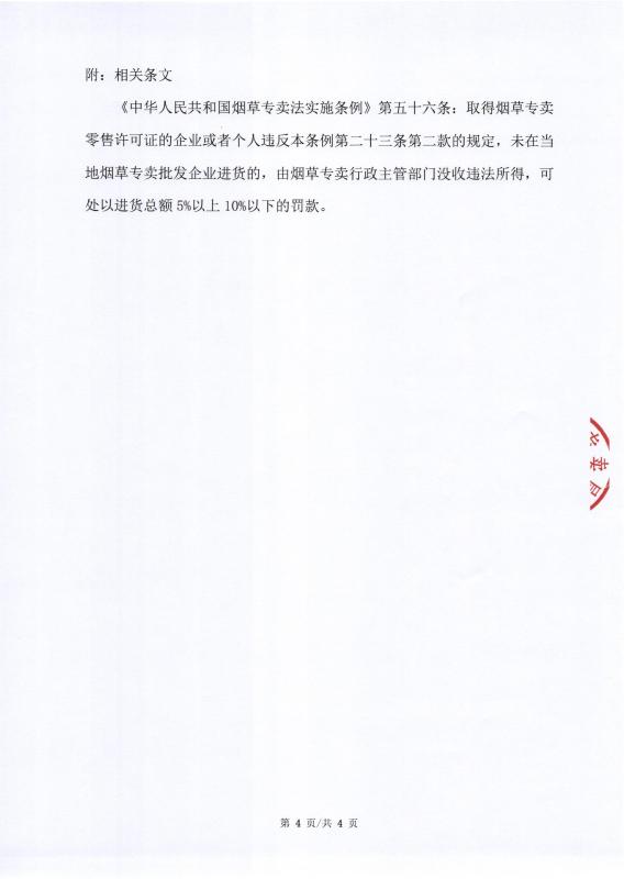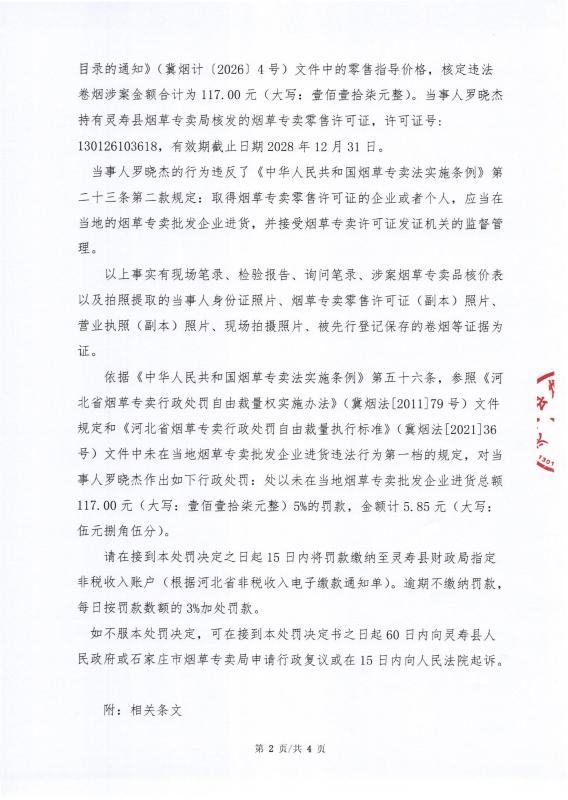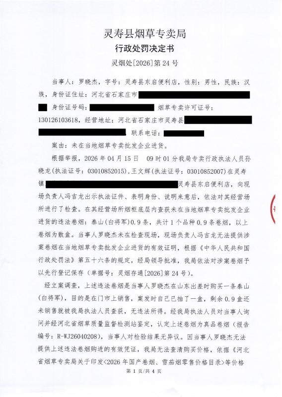 灵寿县烟草专卖局行政处罚决定公示 灵烟处【2026】第24号