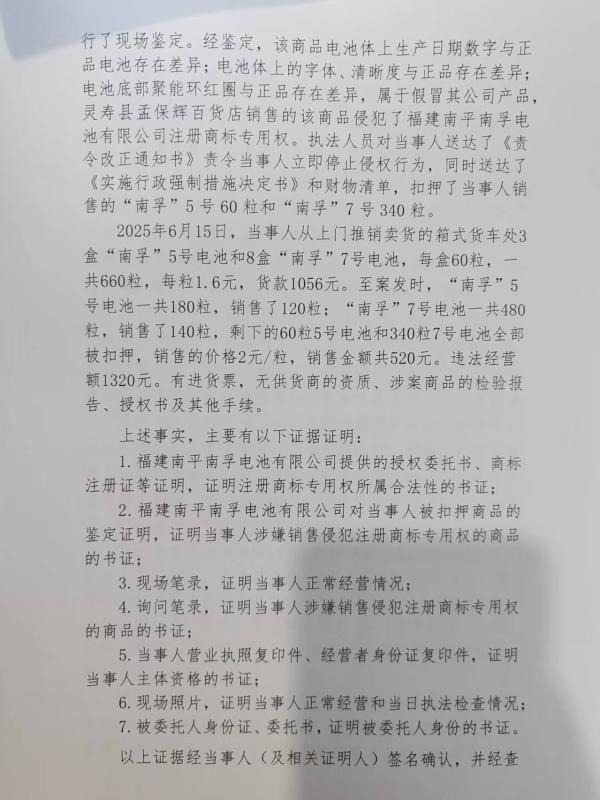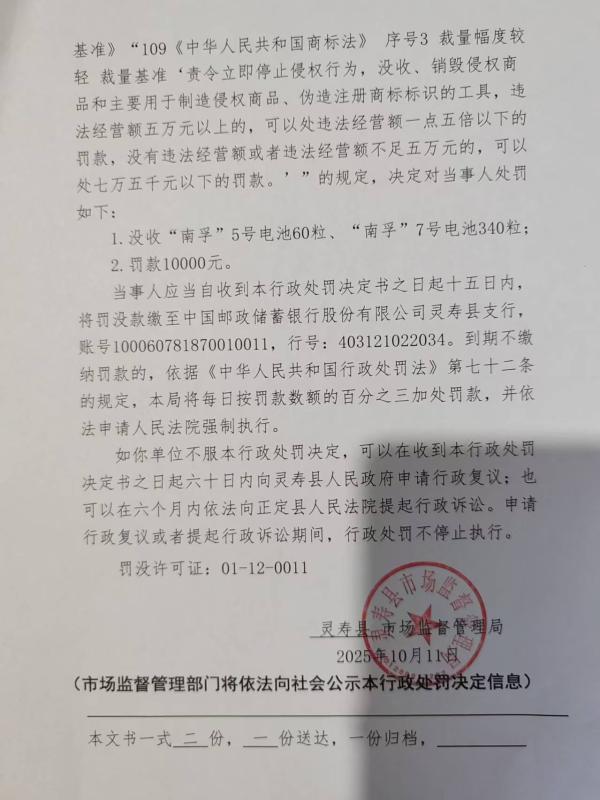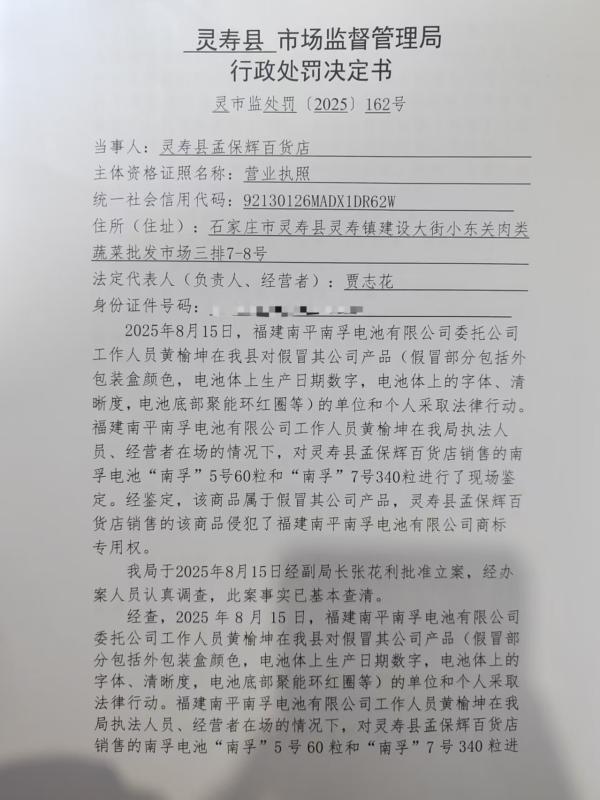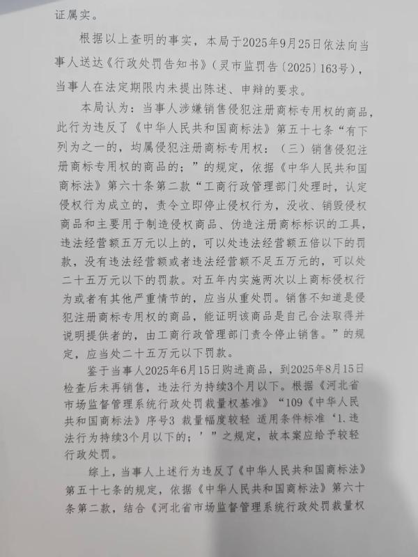 灵寿县市场监督管理局行政处罚公示灵市监处罚[2025]162号