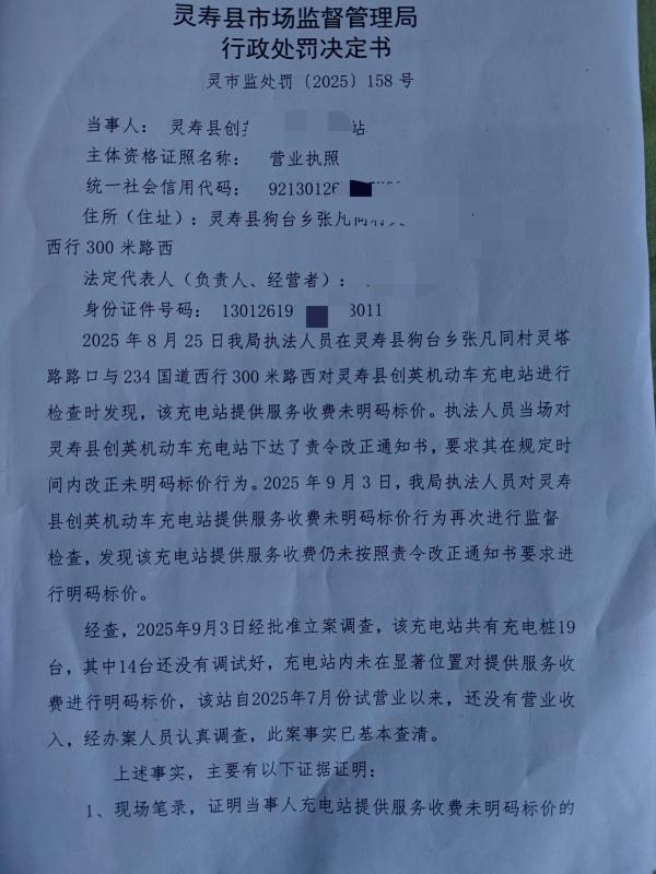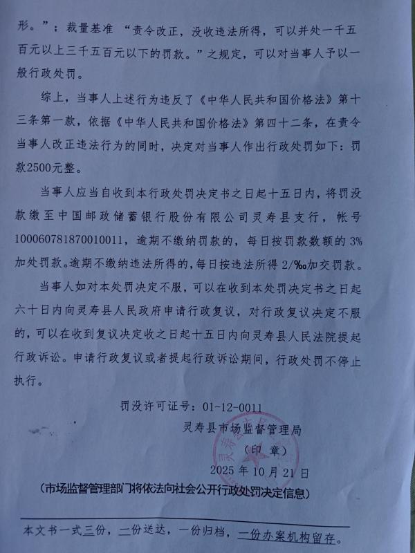 灵寿县市场监督管理局行政处罚公示灵市监处罚(2025)158号
