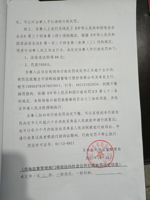 灵寿县市场监督管理局行政处罚公示灵市监处罚[2025]167号