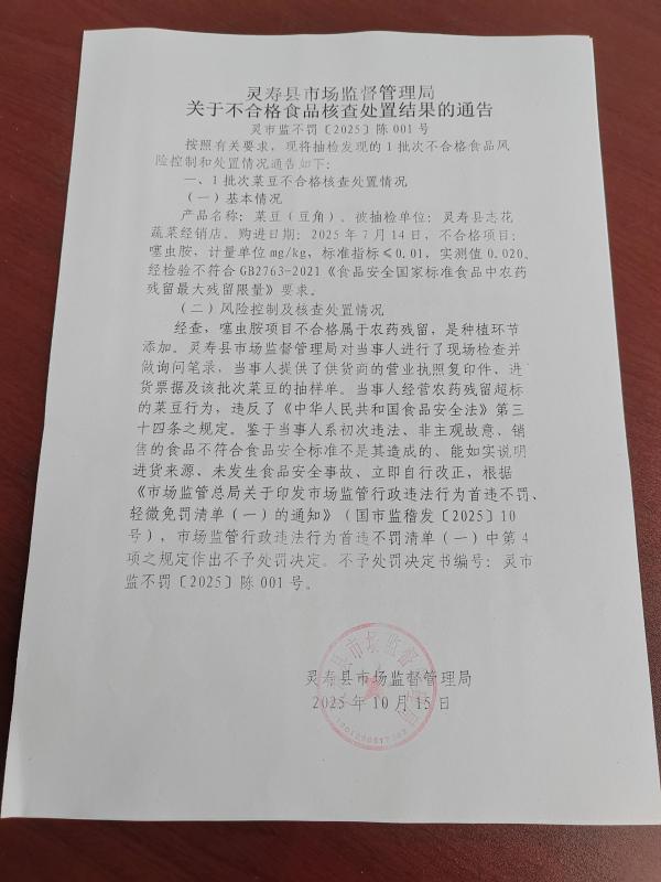 灵寿县市场监督管理局关于不合格食品核查处置结果的通告灵市监不罚【2025】陈001号