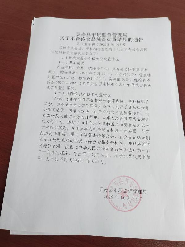 灵寿县市场监督管理局关于不合格食品核查处置结果的通告灵市监不罚【2025】陈003号