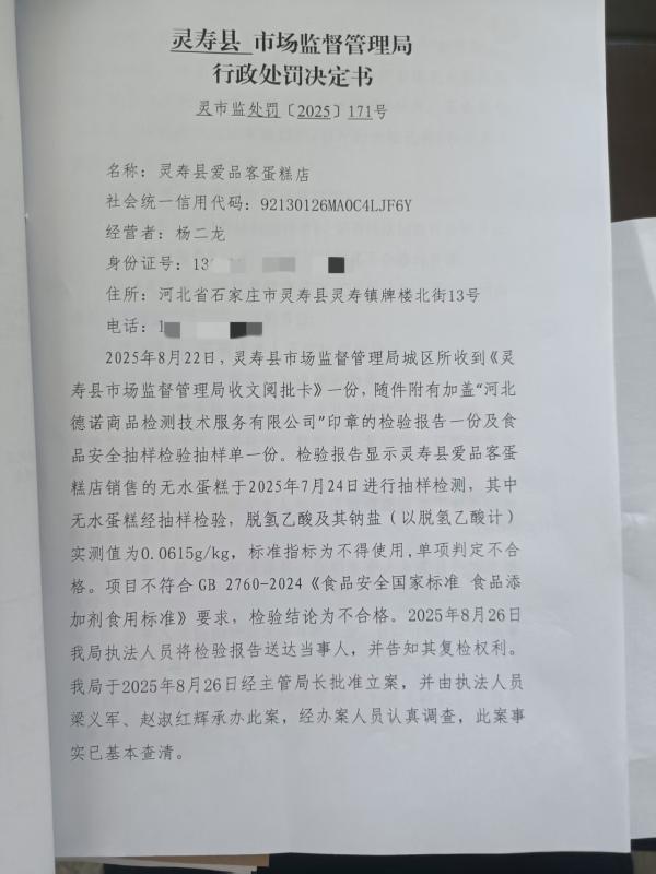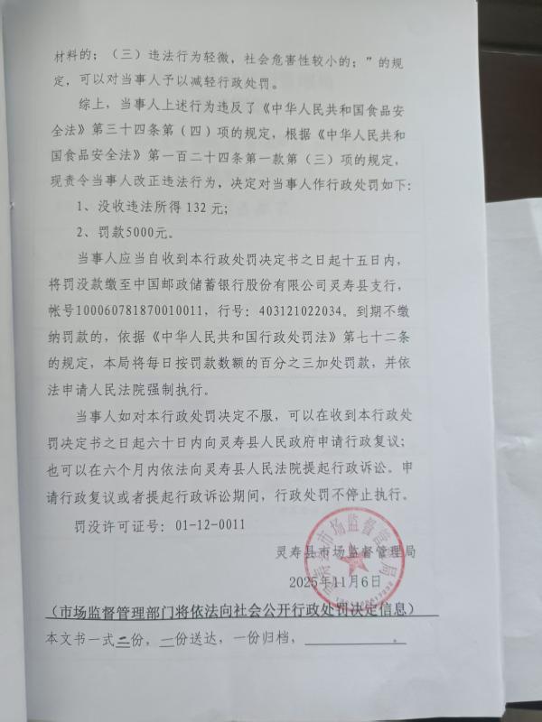 灵寿县市场监督管理局行政处罚公示灵市监处罚【2025】171号