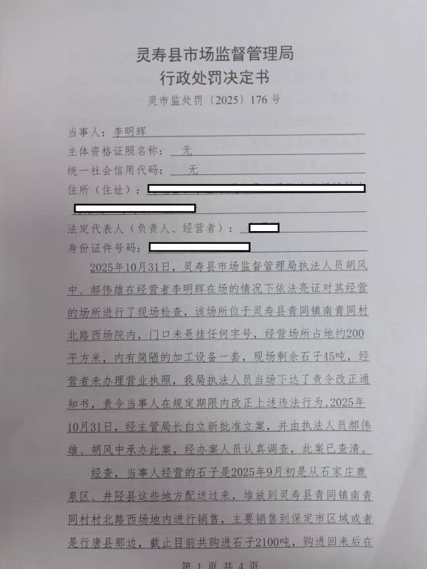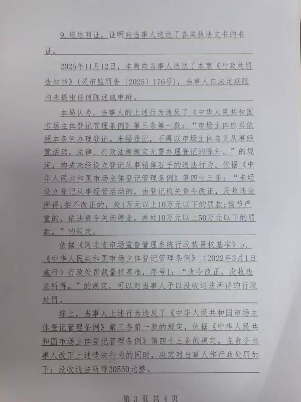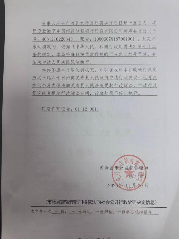 灵寿县市场监督管理局行政处罚公示灵市监处罚【2025】176号