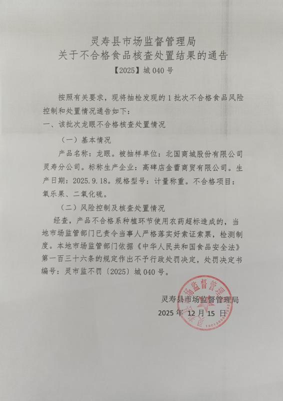 灵寿县市场监督管理局关于不合格食品核查处置结果的通告灵市监不罚【2025】城040号