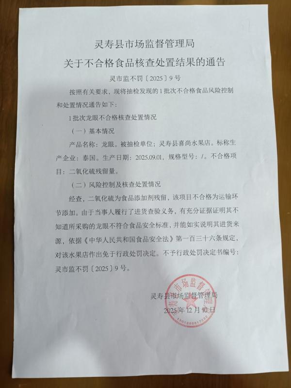 灵寿县市场监督管理局关于不合格食品核查处置结果的通告 灵市监不罚【2025】9号