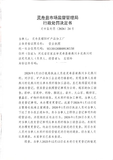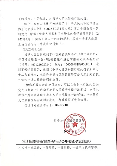 灵寿县市场监督管理局行政处罚公示灵市监处罚【2026】24号
