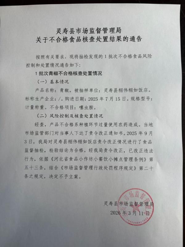 灵寿县市场监督管理局关于不合格食品核查处置结果的通告