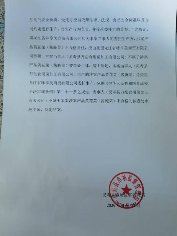 灵寿县市场监督管理局关于不合格食品核查处置结果的通知灵市监{2026}环001号
