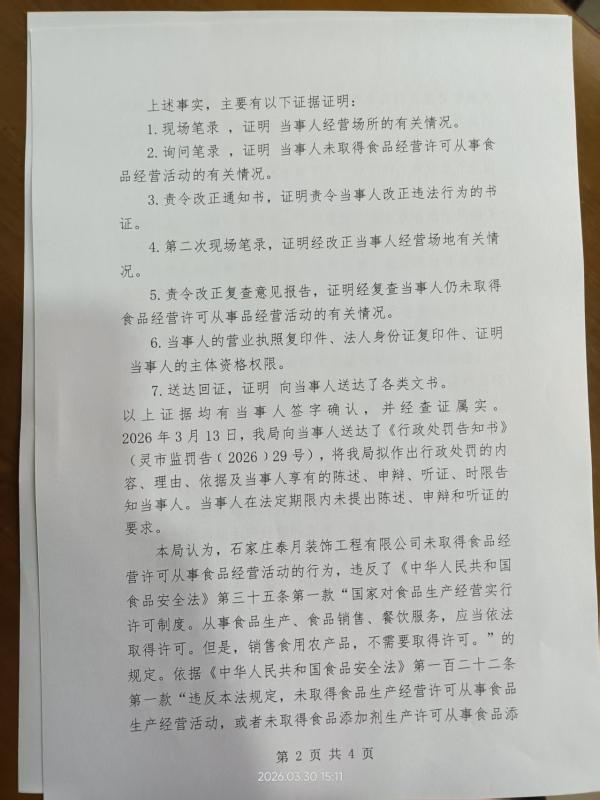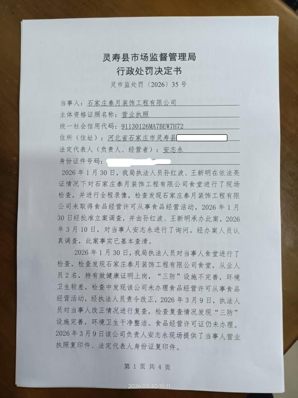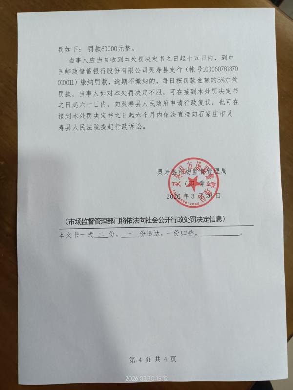 灵寿县市场监督管理局行政处罚公示灵市监处罚【2026】35号